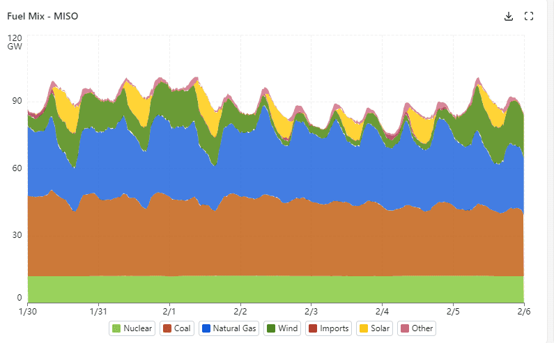 The graph below shows the demand and fuel mix for the MISO ISO for the seven day period 1/30/2026 – 2/5/2026. This was an abnormally cold period for the region. Peak demand during the period was 101 GW on 1/30,1/31, 2/1 & 2/5. Nuclear generation provided a consistent 12 GW during the period. Coal generation fluctuated through the period, declining progressively from 38 GW to 28 GW. Natural gas generation provided the primary load following generation, varying from 40 GW to 20 GW. Wind provided 2 – 20 GW throughout the period, while solar provided 6 – 13 GW. MISO also relied on up to 5 GW of imports and other generation on peak through the period..