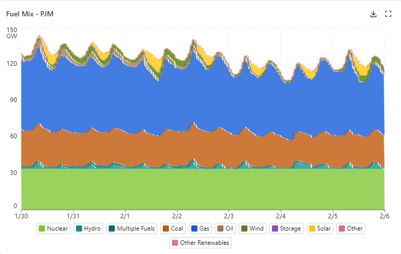 The graph below shows the demand and fuel mix for the PJM ISO for the seven day period 1/30/2026 – 2/5/2026. This was an abnormally cold period for the region. Peak load during the period was 145 GW at 8 am on 1/30. During the period, nuclear provided a consistent 33.6 GW, while coal contributed 25 - 30 GW. Natural gas generators provided the primary load following generation, varying from 44. – 62.8 GW. Hydro provided from 0.4 – 5.7 GW. Solar provided 5 – 10 GW, typically beginning just after the morning peak. Wind provided up to 5.5 GW on most days, but made no contribution on 2/3 & 2/4. Oil provided 4.7 – 6 GW on peak 1/30 – 2/2.