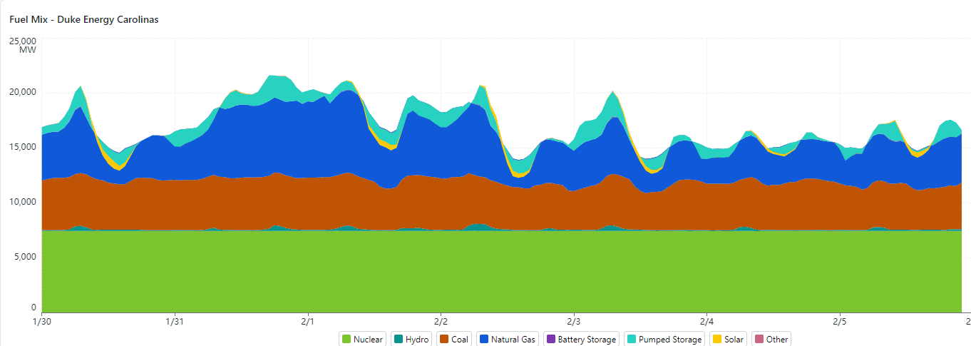 The graph below shows the demand and fuel mix for Duke Energy-Carolinas for the seven days 1/30/2026 – 2/5/2026. This was an abnormally cold period, with weak sun most days and heavy cloudiness, snow and freezing rain on 1/31. Peak load during the period was 20.6 GW at 7:00 pm on 1/31. During the period, nuclear provided a consistent 7.4 GW, while coal provided a relatively consistent 4.8 GW. Natural gas generation provided the primary load following generation, varying from 2.5 – 7.5 GW. Pumped hydro storage provided as much as 2.3 GW in the early evening of 1/31, discharging during peak periods throughout the period and recharging during periods of lower demand. Solar provided only during off-peak periods, and only 400 – 500 MW, with no solar contribution on 1/31. Hydro provided periodic generation each day, with a maximum contribution of 600 MW on 2/2.