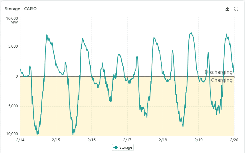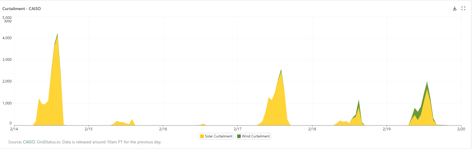 CA ISO curtailed renewable generation, mostly solar, on each day during the period, even while storage was being recharged, as shown below. Curtailments peaked at approximately 4 GW on 2/14.