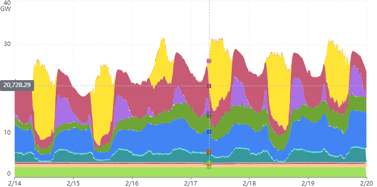 The images below from the Cal ISO Live Dashboard provide interesting insights into the operation of a renewables intensive, capacity constrained grid. Solar generation dominates the generation mix on most days over the period shown, with the exception of 2/16, during daylight hours. Wind generation was available variably but continuously over the period. Storage provided power each day during the evening “duck curve” peak. Large hydro was also increased during the evening “duck curve” peak. Nuclear, geothermal, biomass and biogas generation operated continually throughout the period. Load following generation was provided primarily by natural gas generation and imports. CA ISO does not estimate the contribution of behind-the-meter solar generation, though it totals approximately 20 GW of generating capacity.