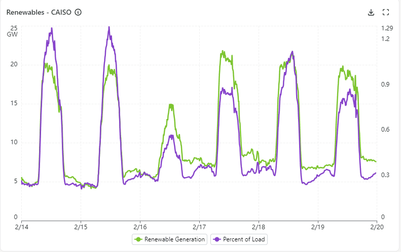 Renewable generation exceeded system load on 2/14, 2/15 and 2/18, reaching a high of 129% of load on 2/14 & 2/15.