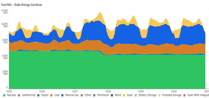 The graph below shows the generation by energy source for Duke Energy Carolina during the week of October 25th through 30th. The first two days are weekend days with lower peak demand. They were also bright, sunny days. Solar contribution peaked at 596 MW on the 25th and 723 MW on the 26th. Pumped storage contributed ~1100 MW to both peaks on the 25th but switched to recharge mode between the peaks when solar energy was most available. Pumped hydro also contributed to both peaks on the 26th and again switched to recharge mode between them when solar availability peaked.