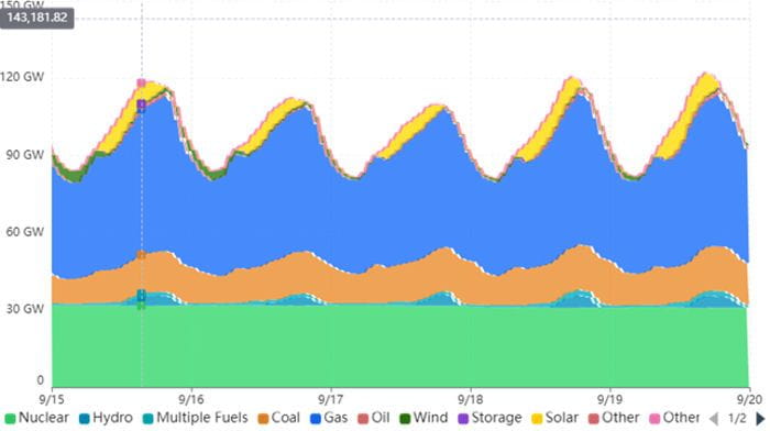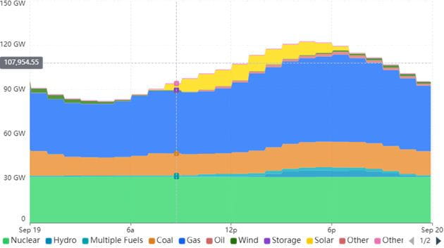 The graph below summarizes the demand and generation mix for the week of September 15th to 19th, the final week of Summer which was more like an early Fall. September 19th was the warmest day of the week. Peak demand was approximately 122 GW, or nearly 25% below the peak demand during the Heat Dome. The nuclear generation contribution remained unchanged during the week, while coal generation was reduced by approximately 50%, likely due to plant shutdowns for scheduled maintenance during the lower demand shoulder months. Natural gas combined-cycle generators provided most of the generation in load following mode, at approximately the same peak capacity as during the heat dome.