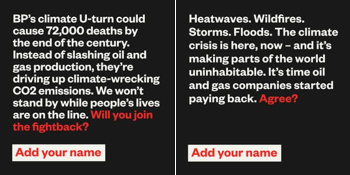 The image on the left below solicits resistance to BP’s shift away from renewables and refocus on its core energy business, based on an unsupported estimate of death which might result. The image on the right below appears to solicit support for climate lawfare against oil and gas companies on the basis that they are causing the "climate crisis", although there is no climate crisis. Interestingly, it ignores coal companies, likely because there is less money available to be “recovered” from them.